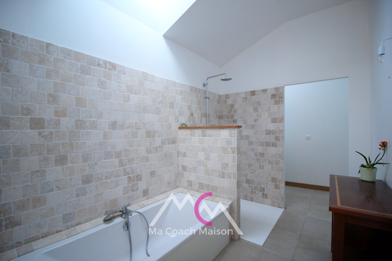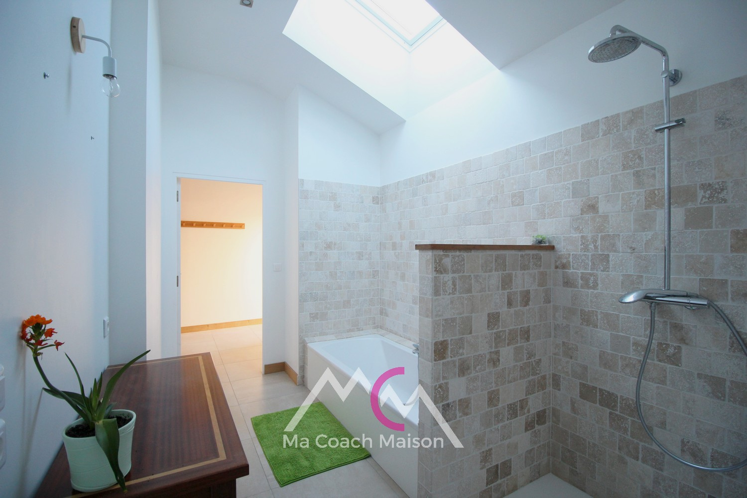 Discret, un dégagement dessert un espace sanitaire comprenant une grande pièce d'eau avec une baignoire et une douche ainsi qu'un espace buanderie, et un wc suspendu avec lave-mains.