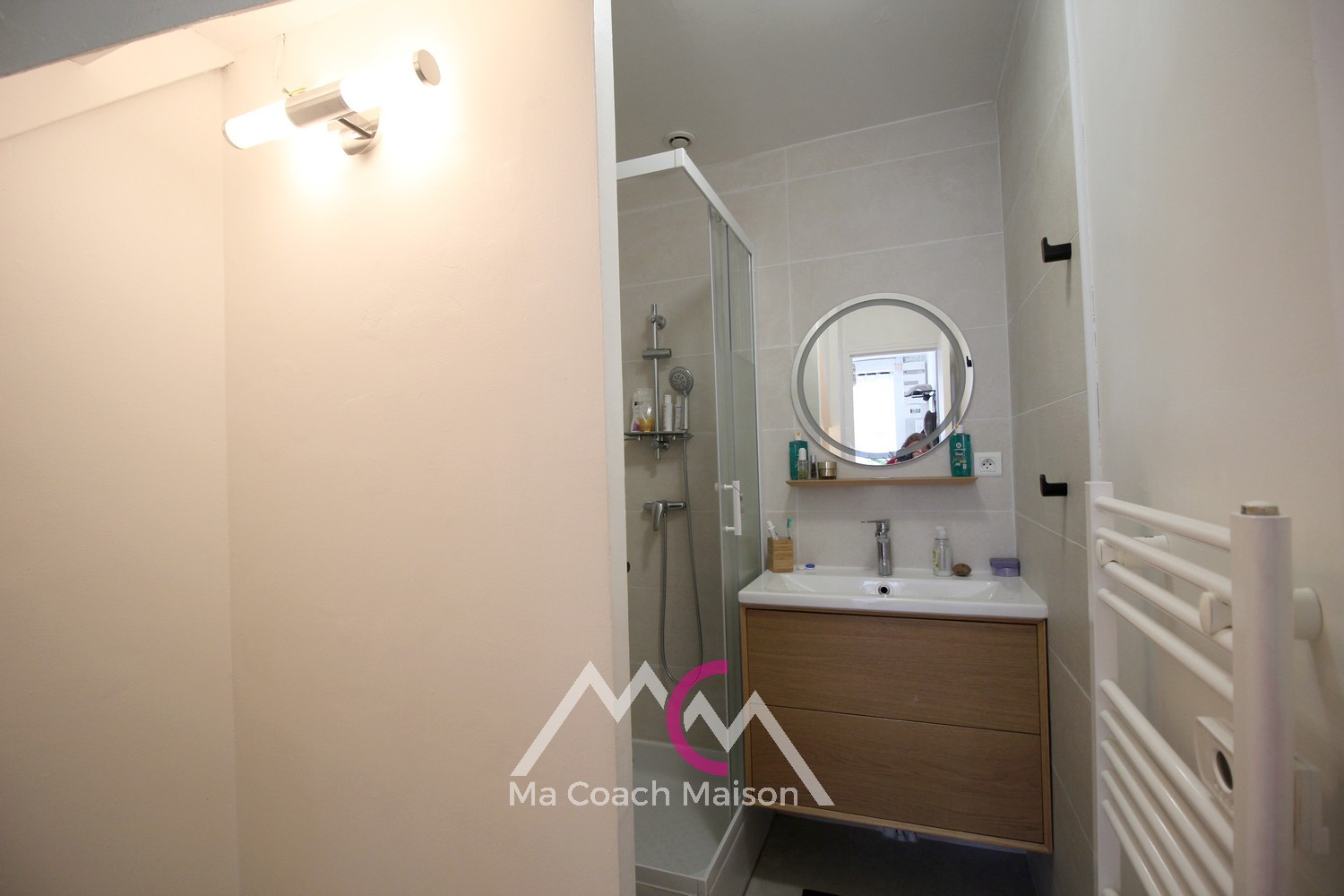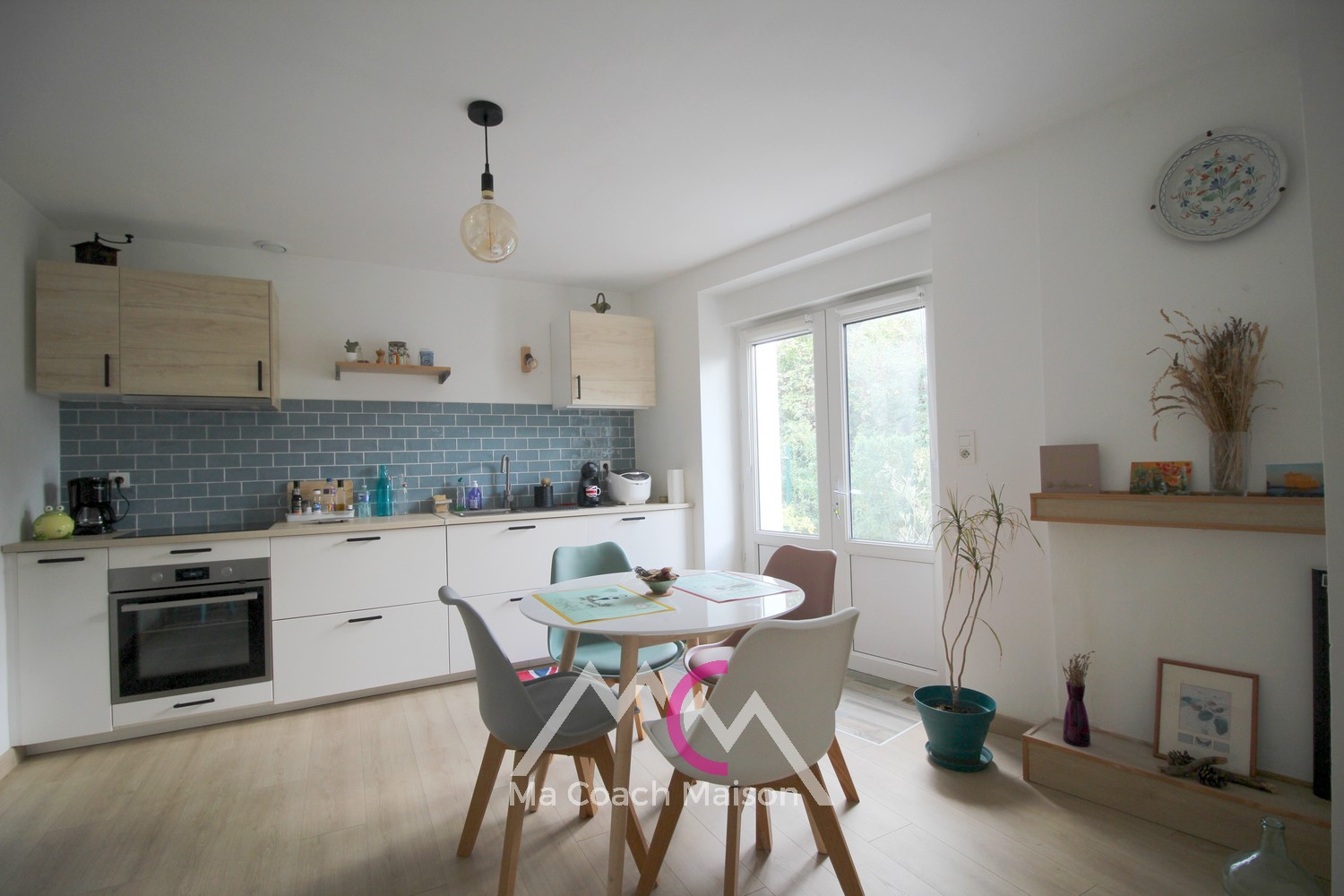 - au rez-de-chaussée : une entrée, une cuisine aménagée (éléments hauts et bas) et équipée (hotte, four, plaque), un dégagement, un salon-séjour, un salle d'eau avec wc.