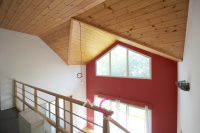 Les menuiseries offrent une surface vitrée importante côté Sud, laissant entrer le soleil l'hiver. L'été, l'avancée de toiture protège de la chaleur.