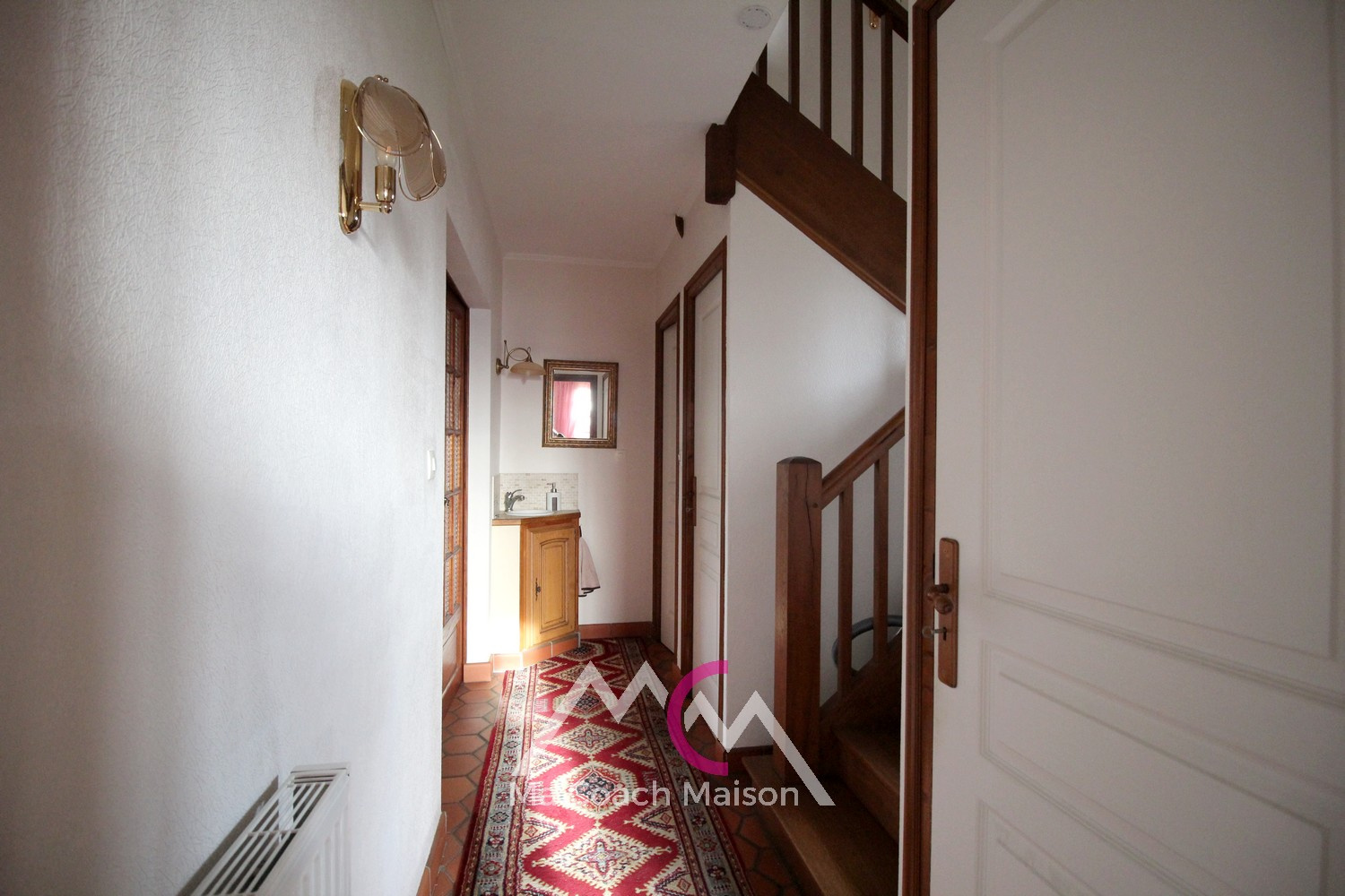 Un dégagement dessert une chambre avec cabinet de toilette, un wc et l'accès à l'étage par un bel escalier en bois, ainsi qu'un accès aux sous-sol.