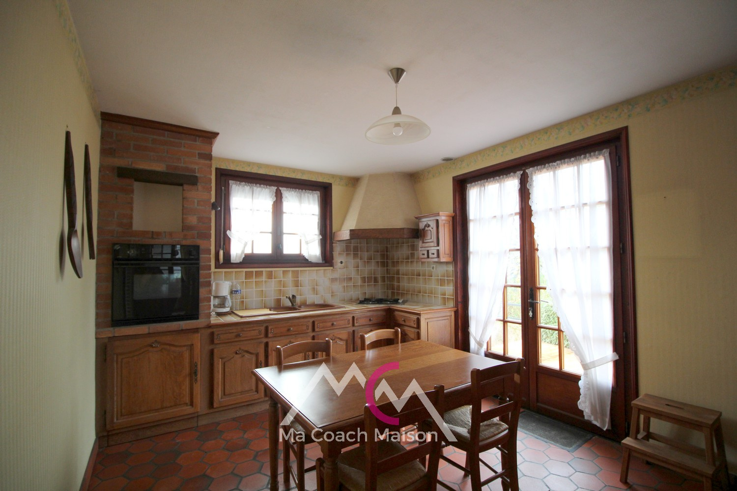 La cuisine est aménagée sur-mesure et profite d'une très belle surface, ainsi qu'un accès sur la terrasse extérieure.