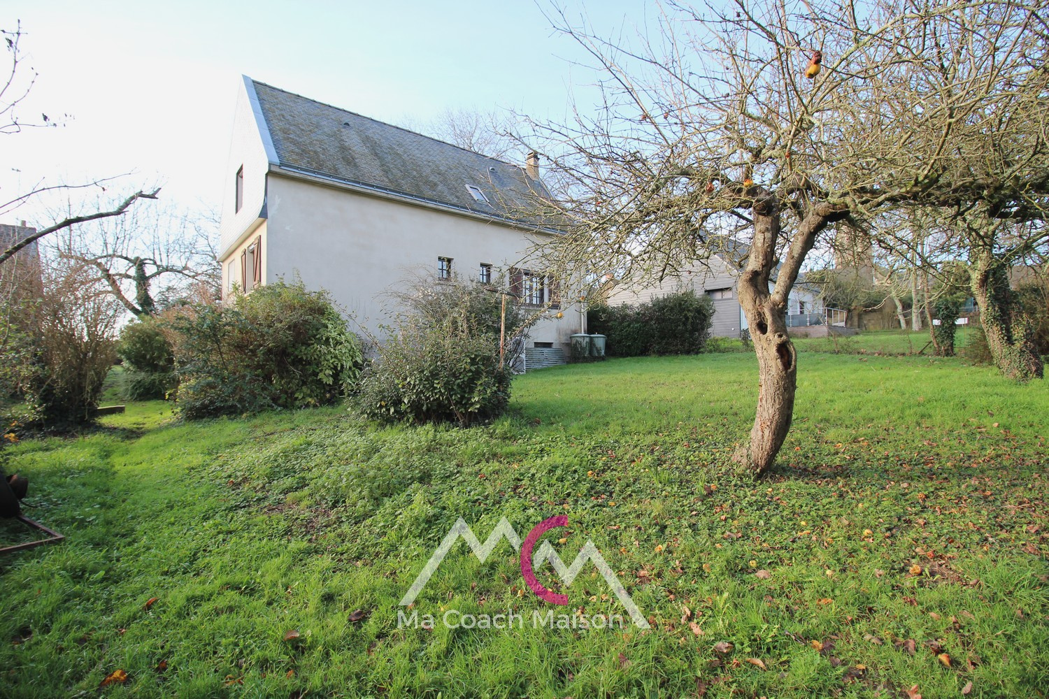 À l’extérieur, le jardin arboré accueille plusieurs arbres fruitiers, un espace potager et un abri de jardin en bois, offrant un cadre agréable et verdoyant.