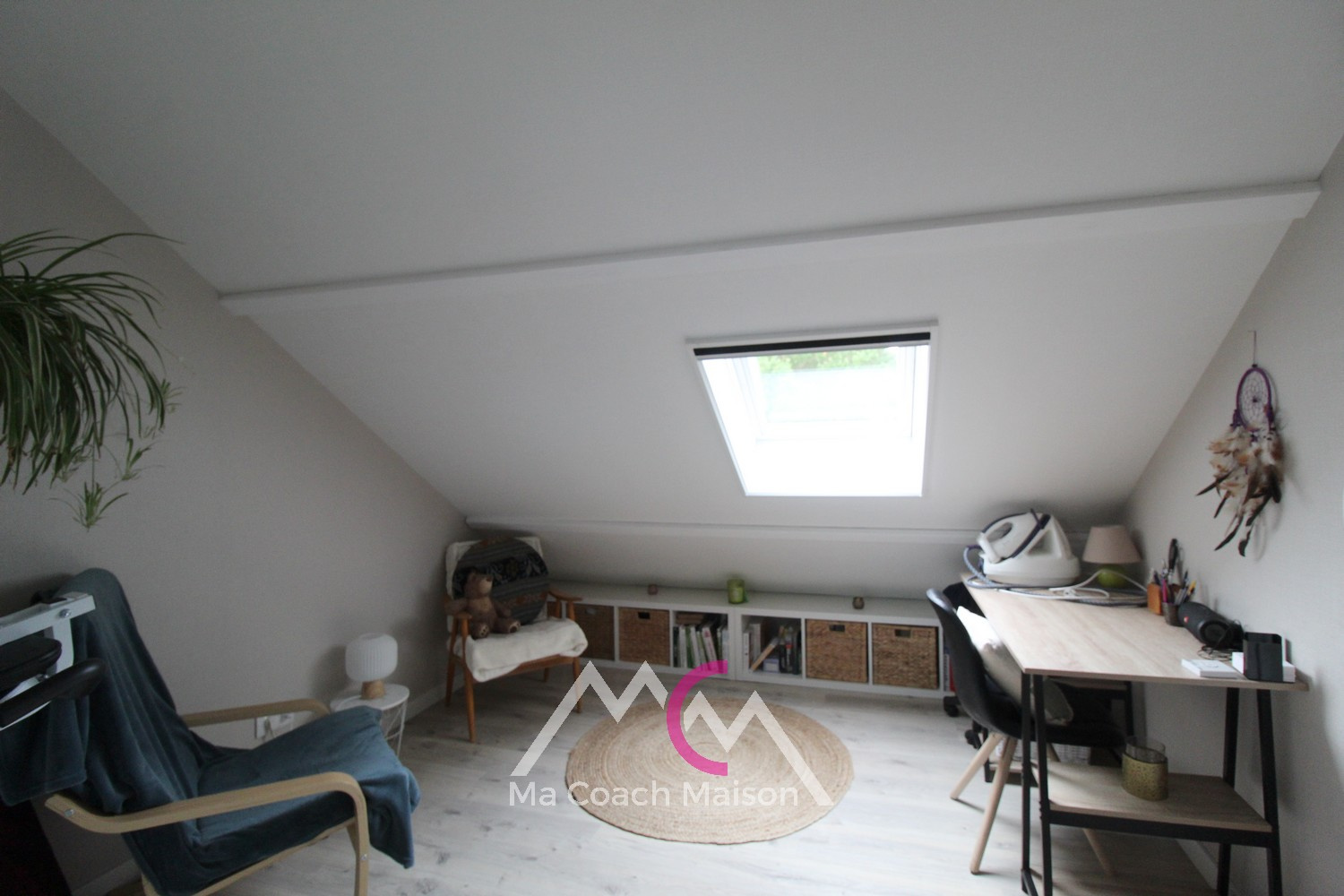 À l’étage, le palier dessert deux chambres, un bureau et une salle d’eau avec WC.