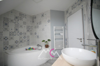 A l'étage, un palier dessert 3 chambres, une salle de bains avec baignoire d'angle, un wc.