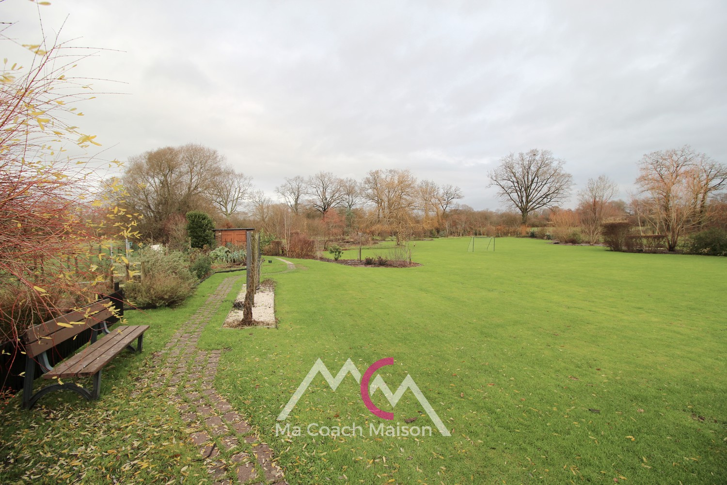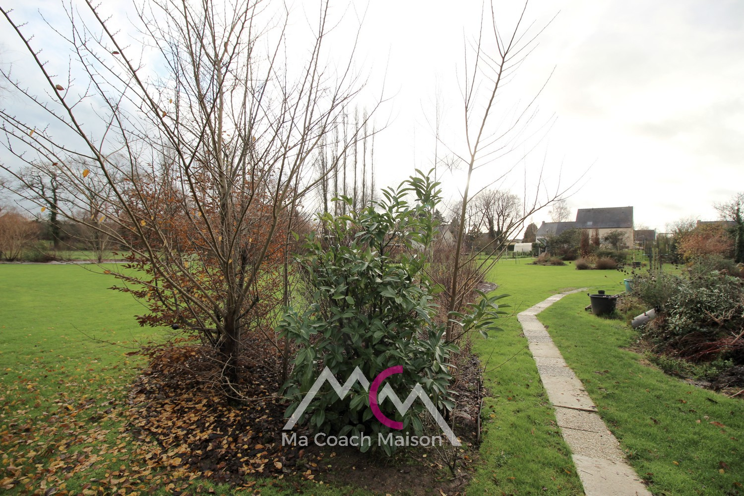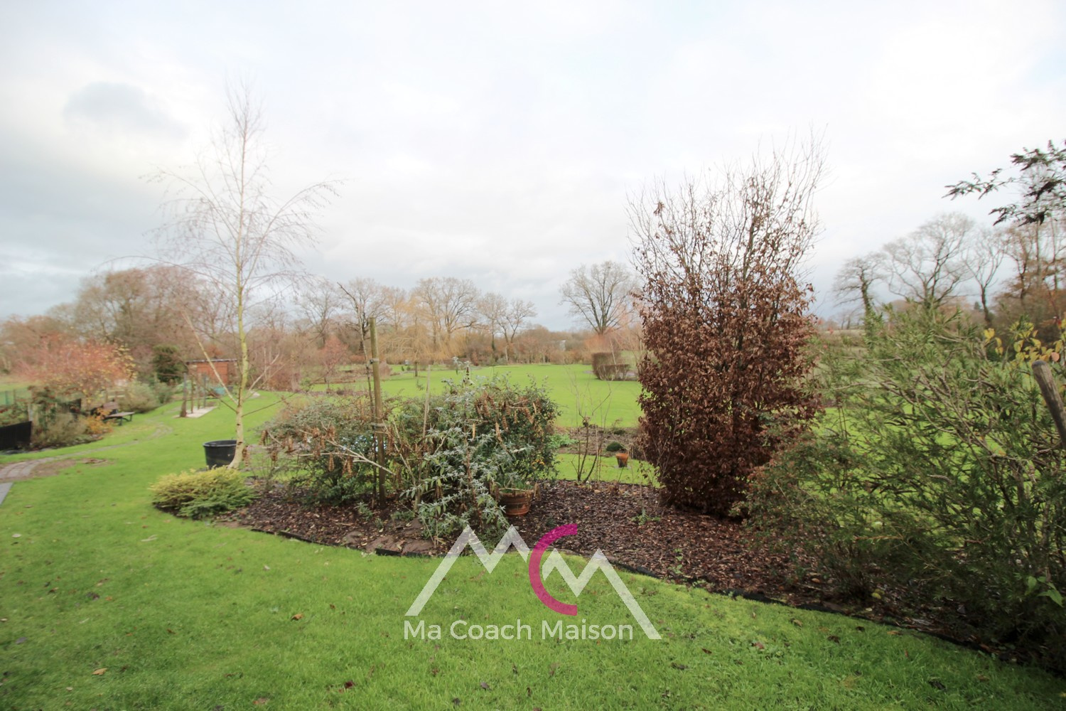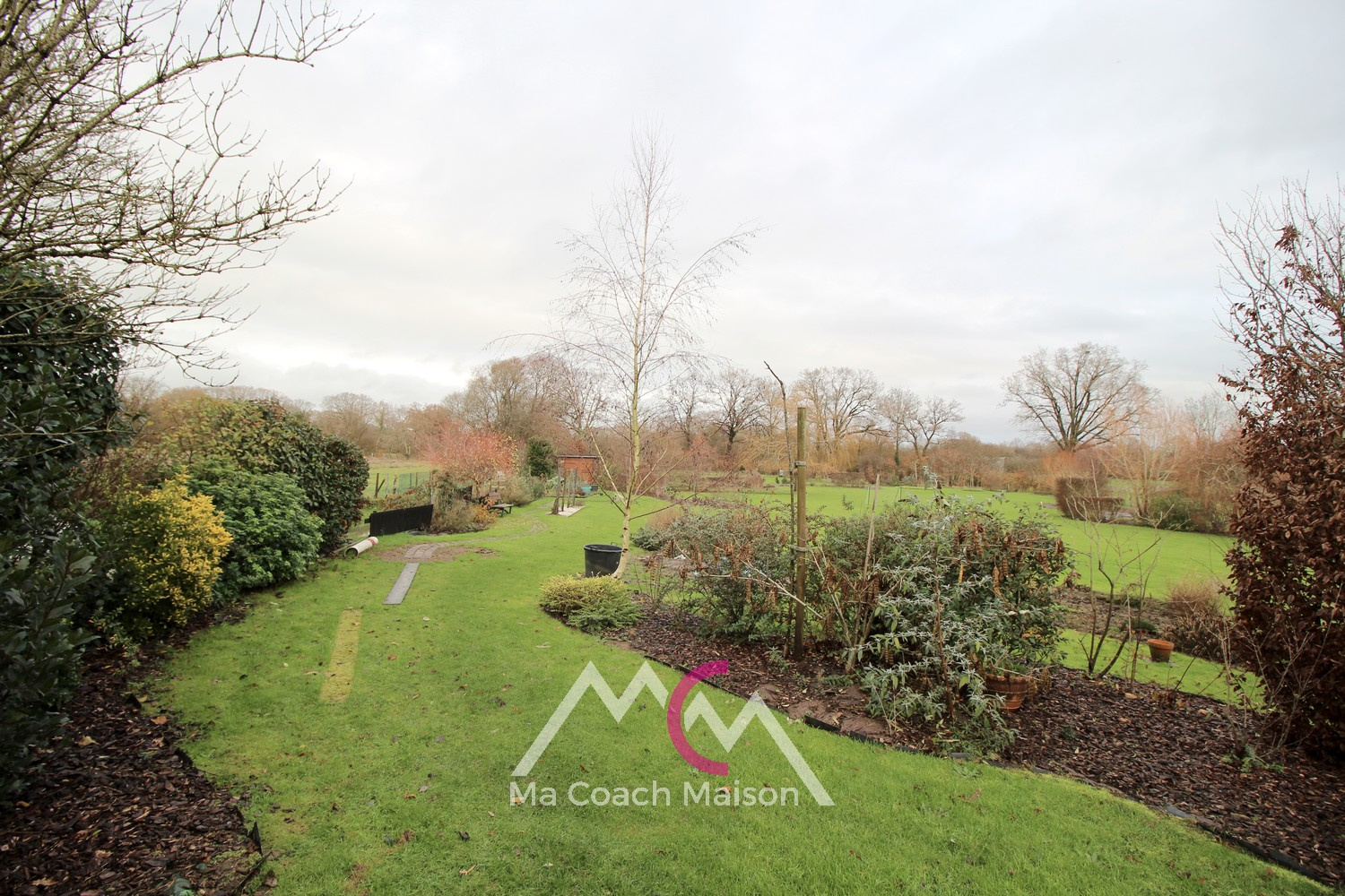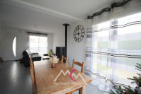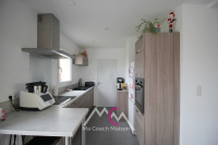 Au rez-de-chaussée, l'entrée donne sur un salon-séjour avec un poêle à granulés et une cuisine ouverte aménagée et équipée avec une vue sur la jardin paysagé.