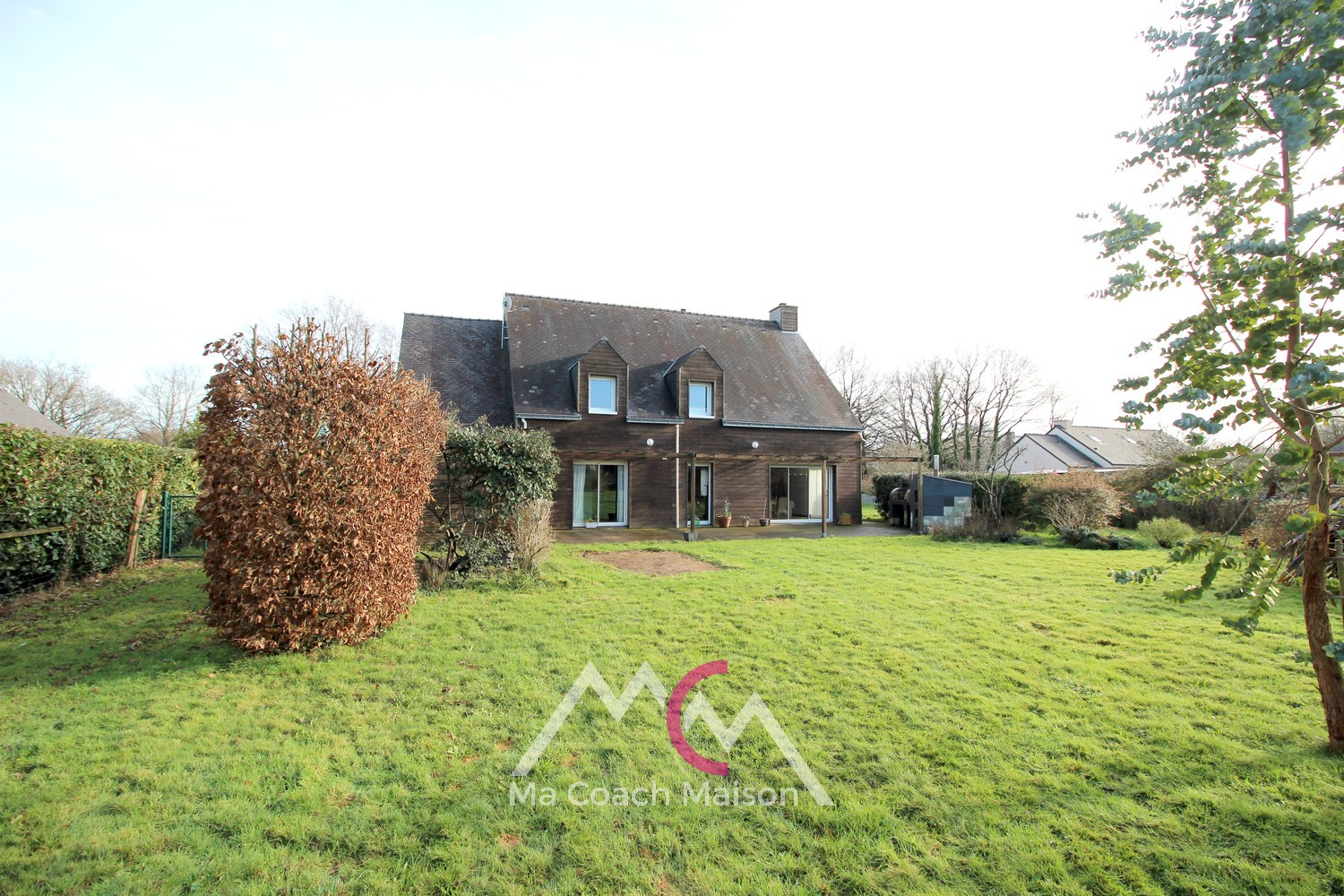 Une terrasse avec pergola en bois, un garage et un préau attenants complètent l’ensemble.