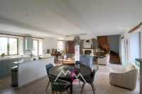 Cette agréable maison offre une pièce de vie exposée plein Sud d’environ 48 m², comprenant un salon-séjour équipé d’une cheminée avec insert, ainsi qu’une cuisine aménagée et semi-équipée.