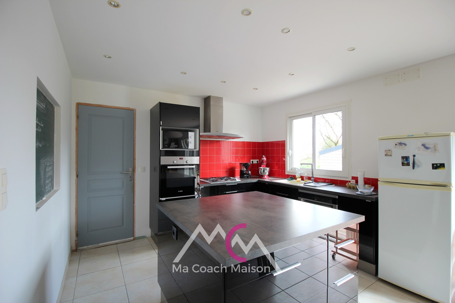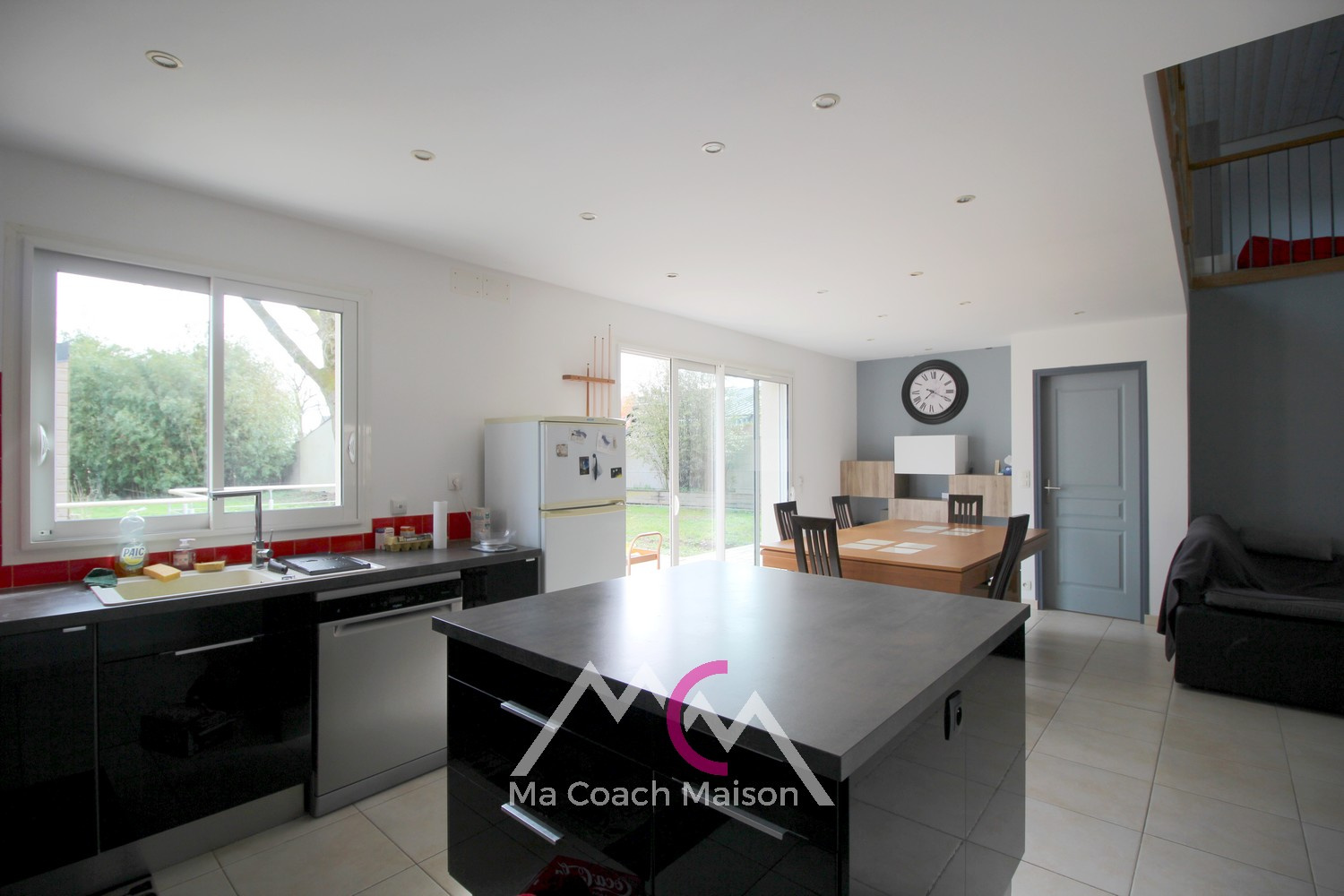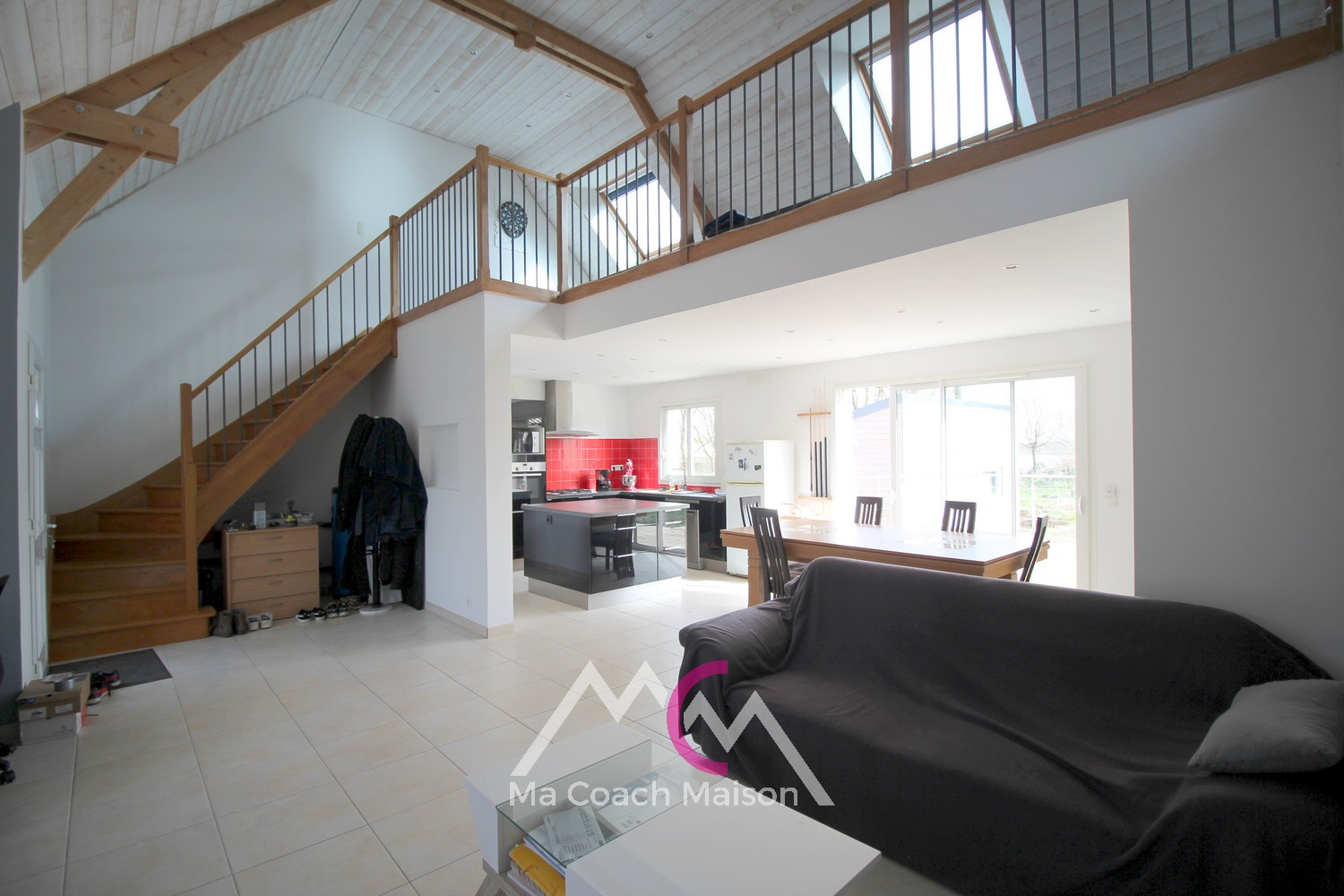 L'entrée donne sur un salon-séjour lumineux grâce à son plafond cathédrale et une cuisine aménagée et équipée, représentant un bel espace de vie de près de 50m² !