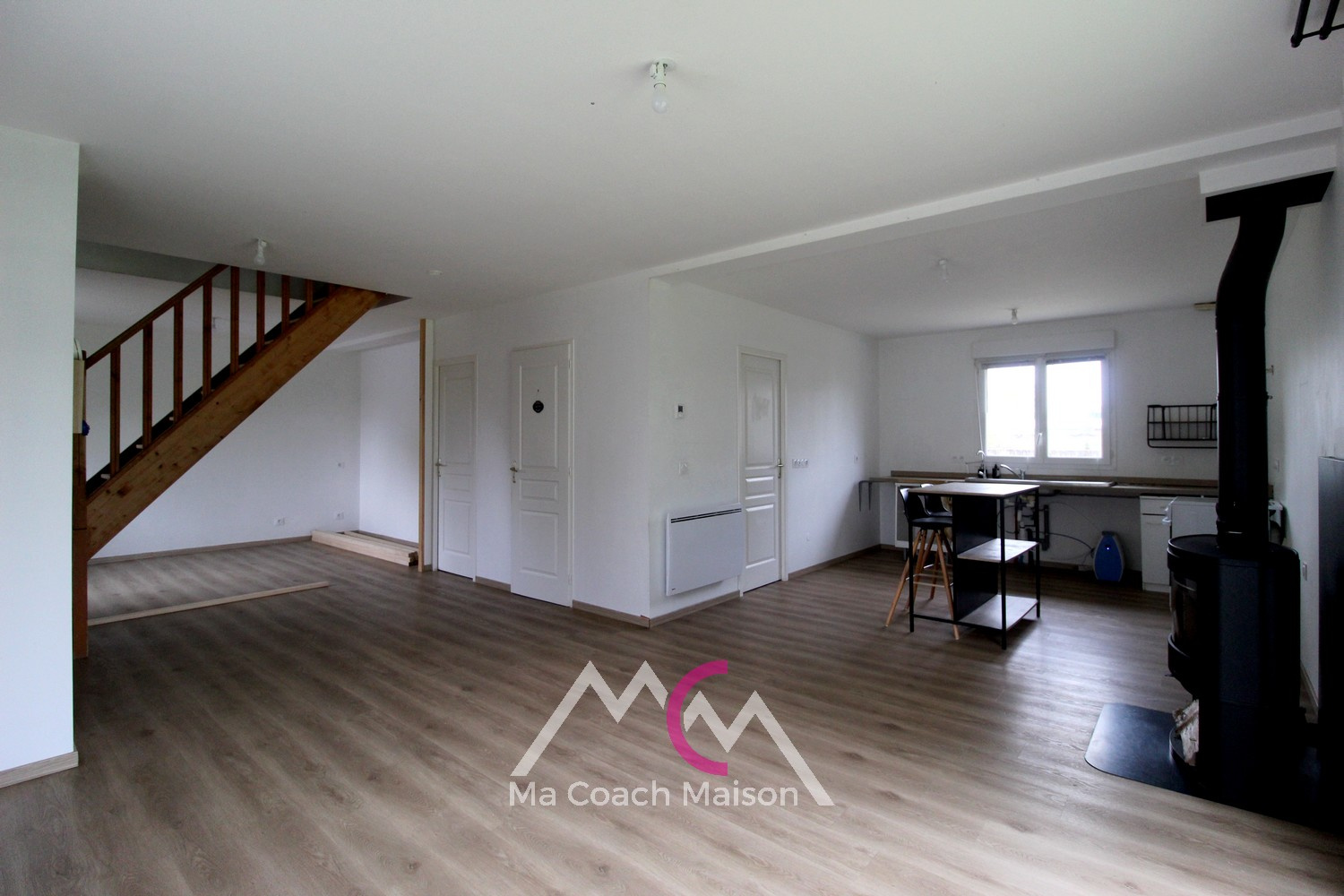 Elle comprend au rez-de-chaussée un salon-séjour avec un poêle à bois, un espace cuisine ouvert à aménager selon vos souhaits, une arrière cuisine.