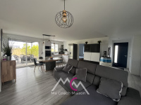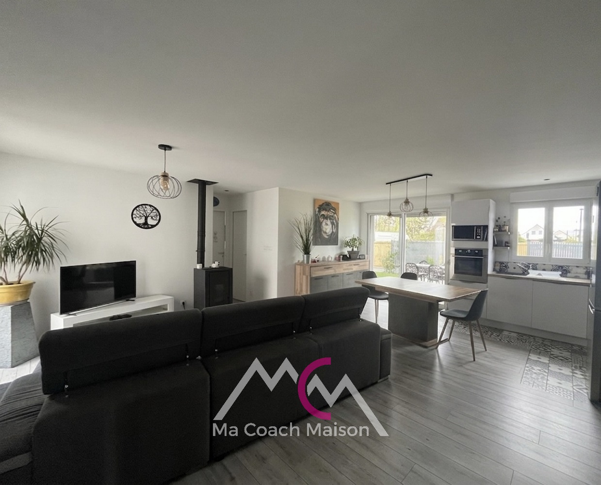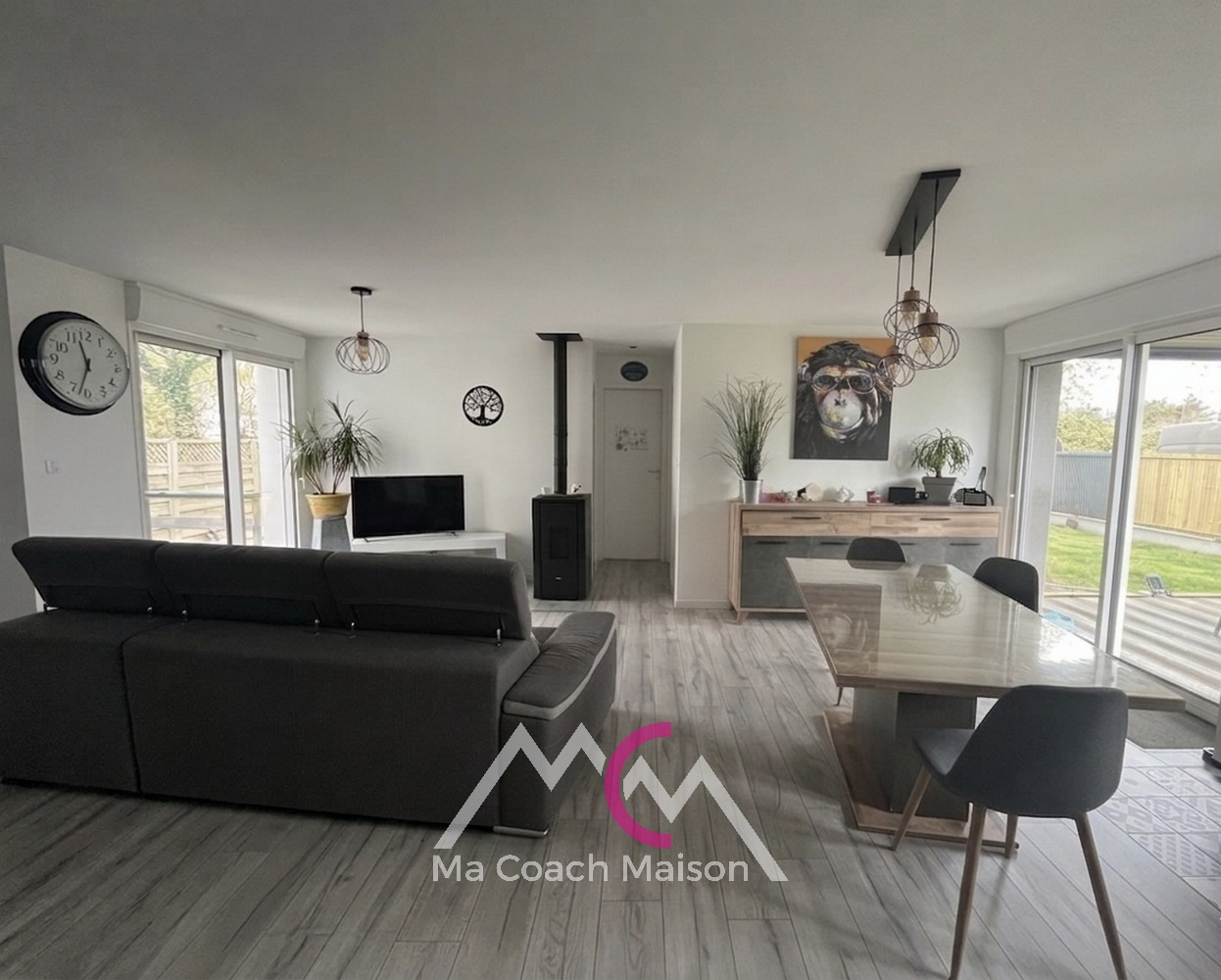 Le séjour, chaleureux et convivial, est agrémenté d’un poêle à pellets et s’ouvre sur une cuisine moderne, aménagée et entièrement équipée.